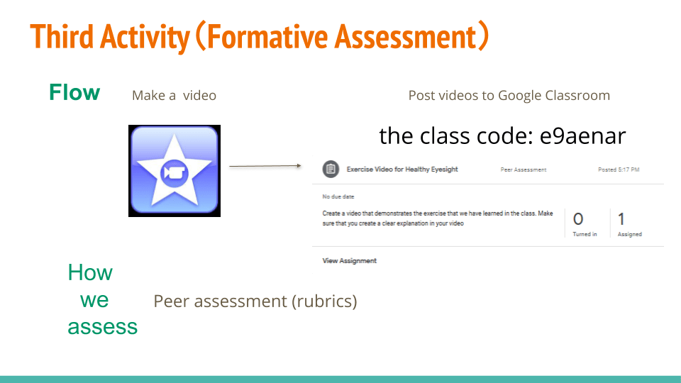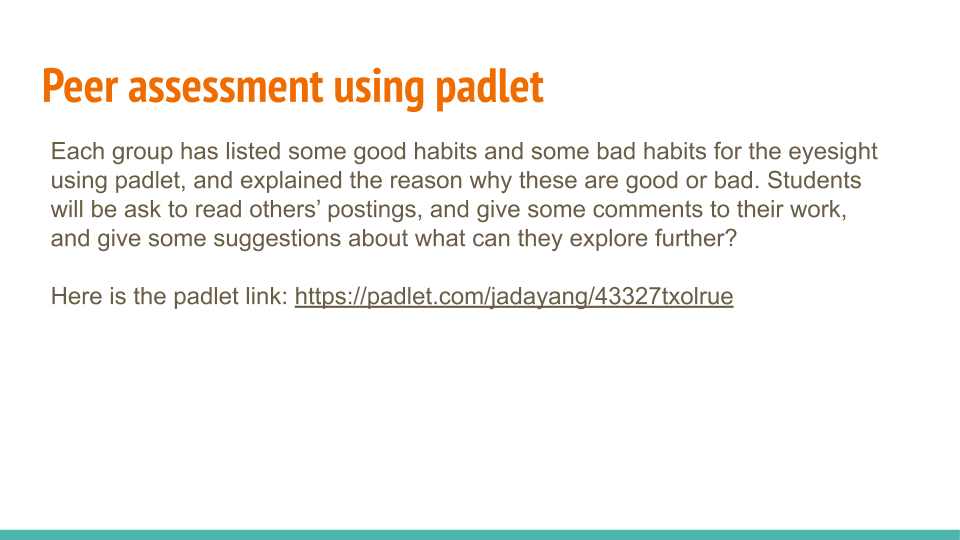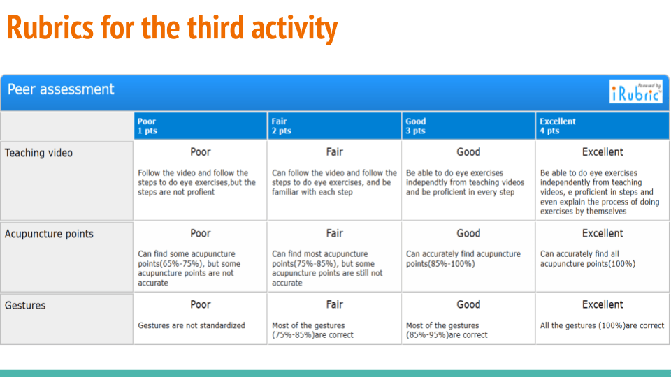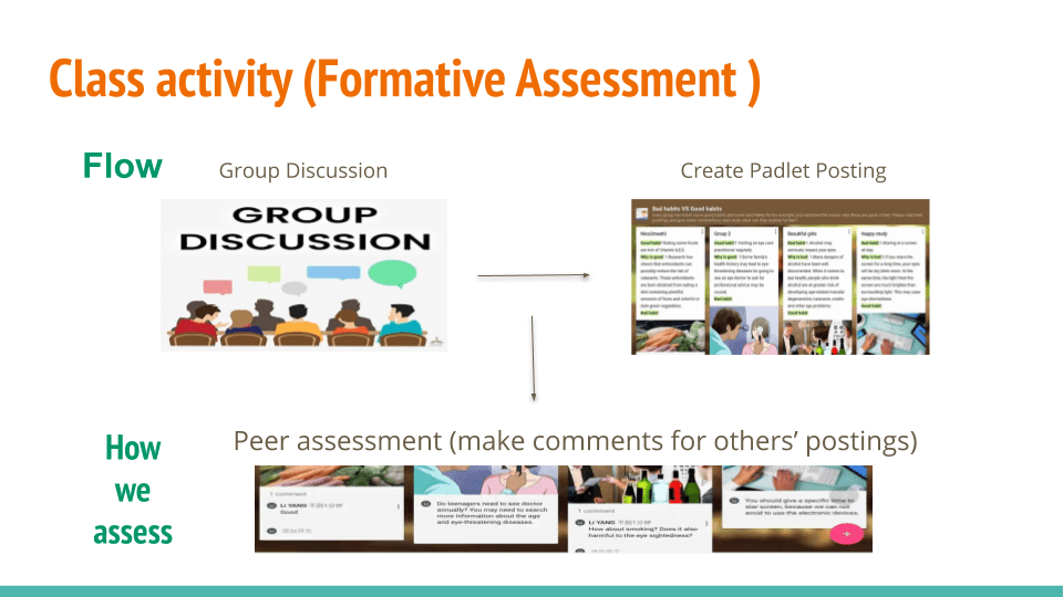 | Nice2MeetU | Platform to help create peer assessment | https://www.peergrade.io/ | Formative / peer evaluation | It could automatically distribute the assignment to eache students The teachere could see the result so they could have data-driven learning. |